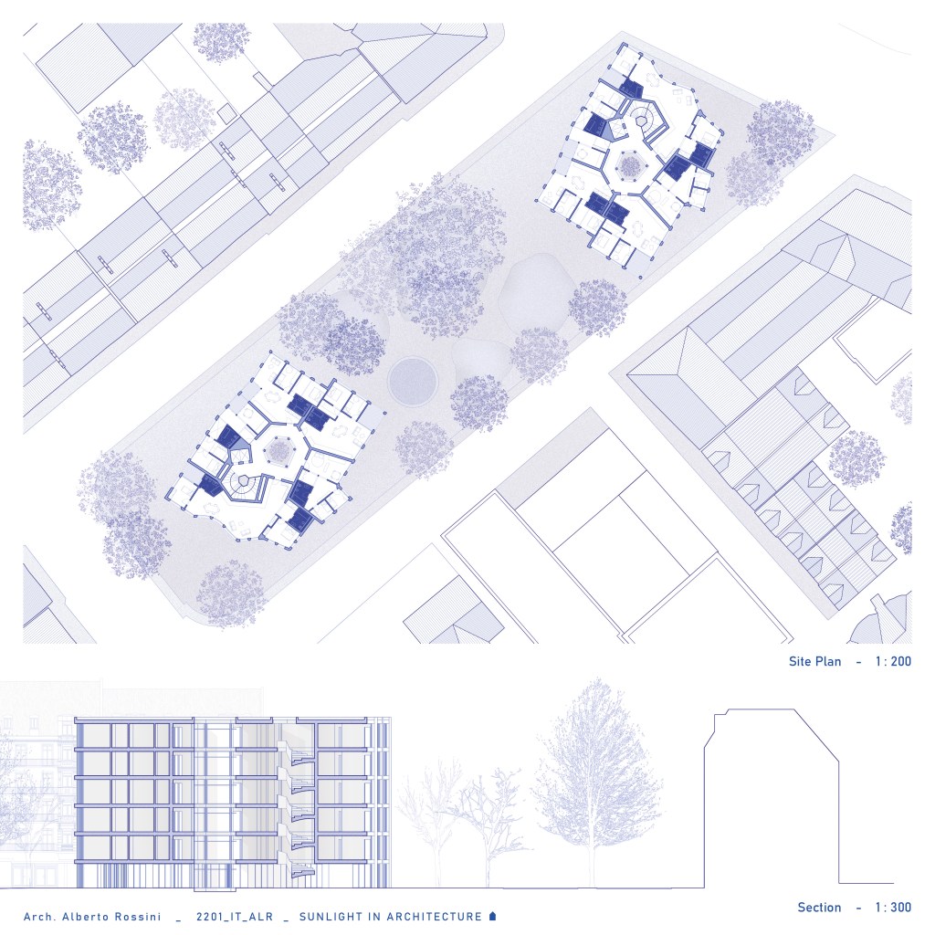 The shape of the building arises from the study of a central connecting space between the individual apartments that revolve around the distribution system and this allow them to use the entire footprint of the building.